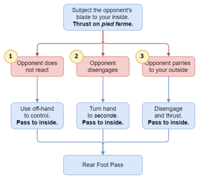 - Subjecting their blade until they feel the need to redress the balance. The idea is to dominate or subject the opponent's blade so that it crosses their body, pushing their point well off-line and maintaining your point on-line directly at the opponent. If this doesn't rattle them and force them to redress the situation, nothing will. Remember that the direction in which you subject the opponent's blade (either to your inside or your outside), this is the attack path you will use by default.