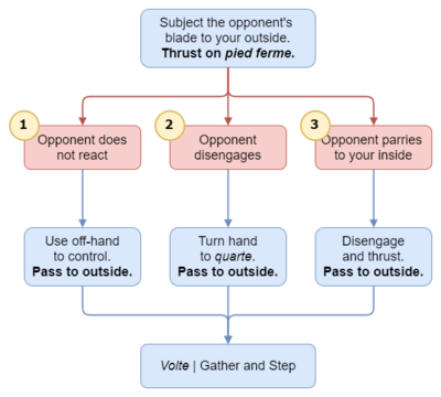The means to achieve these three objectives is using the posture of the pied ferme. If the opponent does not act, withdraw, re-assess and try again.
