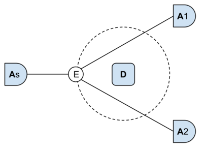 Action: The attacker starts out of distance and approaches until they reach the defender's defensive distance (E). At this point, they make a half-thrust to the subject the defender's blade. The defender, starting at the location marked (D), has an objective which varies depending on the variant. The attacker continues to their chosen objective, A1 or A2.